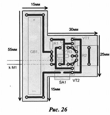 Большинство элементов схемы монтируется на плату из односторонне фольгированного текстолита. Эскиз топологии печатных проводников дан на рис. 26.
