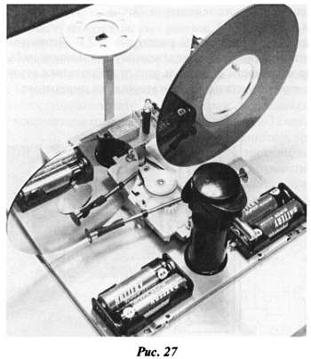 В ней применены элементы и узлы от различных устройств компьютерной техники. Например, от DVD-привода. Из металлической крышки вырезано основание 3. К нему приклеены три опоры 1 (шестерни) в дух из которых закреплены Г-образные пластмассовые подвесы 2 и двигатель с редуктором 6, которые выпилены лобзиком из лицевой панели привода. От него же взяты молоточки 9 (винты) и металлическая ось 11. Диски 7 и 8 из винчестеров от НЖМД старых системных блоков компьютеров свободно подвешены в углублениях подвесов 2.