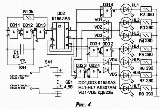 Генератор импульсов собран на логических элементах микросхемы DD1. Прямоугольные импульсы с его выхода (вывод 8) подаются на счетный вход микросхемы DD2 (вывод 9). По фронту четвертого импульса, благодаря обратным связям через элемент DD1.4, происходит обнуление триггеров (в начале седьмого такта). В остальном работа устройства происходит так же, как и предыдущего.