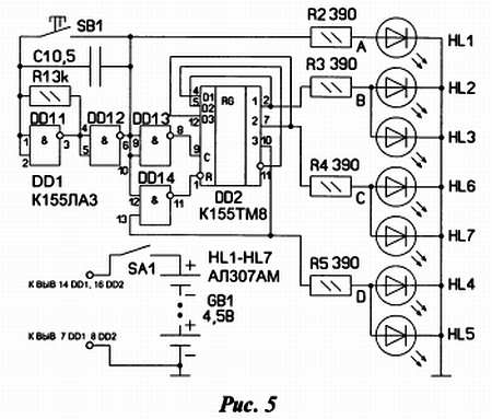 Появление ярких светодиодов с током потребления в доли миллиампера при заметном свечении сделало возможным реализацию кубика в шесть граней согласно схеме рисунка 10.