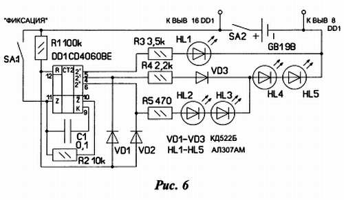 Далее рассмотрим несколько вариантов схем на KMOП-микросхемах. Электронный кубик (рис. 6) собран на микросхеме CD4060BE (DD1). Она представляет собой двоичный счётчик с дешифратором и встроенными элементами для построения генератора импульсов. Светодиоды HL1-HL5 образуют индикатор. Частота следования переключающих импульсов определяется параметрами элементов С1 и R2. Для упрощения схемы и в целом конструкции вариант кубика реализован с использованием индикатора, в котором грань «6» заменена гранью «пусто — зеро».
