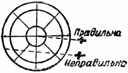 В обоих случаях наводки точку на соответствующем кольце выбирать таким образом, чтобы продолженный путь самолета проходил через середину кольцевого целика (рис. 35). Если самолет летит прямо на обстреливающий его пулемет, наводить через задний визир и центр перекрестия кольцевого целика.