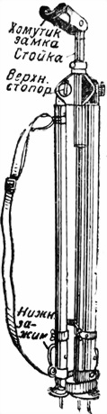 6. Установить пулемет на стойке, для чего взять пулемет левой рукой — за кожух (прижимая одновременно зажимную пружину средней опоры), а правой рукой — за приклад, повернуть пулемет прицелом вниз, ввести средней опорой в хомутик замка, повернуть пулемет в нормальное положение и отпустить зажимную пружину.