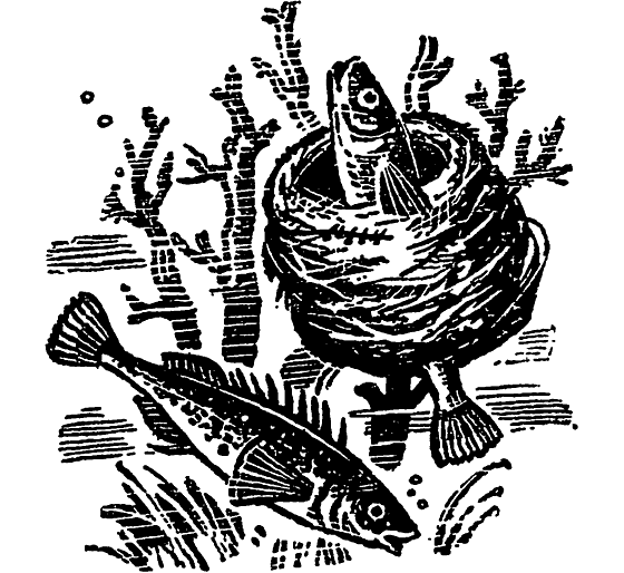 Есть и другие рыбки, строящие гнезда. Одни из них делают гнезда посложнее, другие попроще. Самое простое гнездо — ямка в песке, на дне реки. Выроет рыба ямку, вот и готово гнездо. Самка положит в ямку икру, самец останется сторожить гнездо, охранять икру. Таково, например, гнездо у нашей маленькой рыбки бычка-подкаменщика.