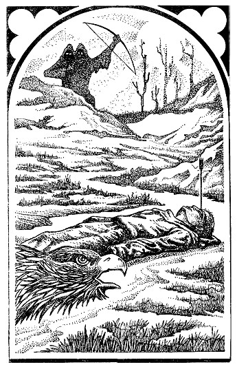 Через некоторое время он достиг леса. Канюки трудились над человеческими останками. Путник разогнал птиц своим посохом-копьем и осмотрел останки. Основные части тела отсутствовали. В черепе, выходя сзади из шеи, торчала стрела. Старик тревожно оглядел заросли вокруг. Ничего не было видно, но возле дороги осталось множество следов. Находиться здесь было небезопасно.