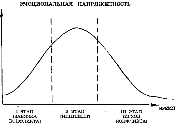 На 1-м этапе растет эмоциональное напряжение. На 3-м оно, напротив, спадает. Люди осознают, осмысливают произошедшее, предпринимают различные шаги к восстановлению, налаживанию отношений. Эти два этапа, опоясывающие инцидент, значительно превосходят его по продолжительности. Действия здесь имеют чаще всего не явный, а скрытый характер, то есть участники проигрывают различные варианты в своем воображении. В действительности же ведут себя сдержанно и корректно, что, правда, не исключает наличия эмоционального напряжения и вспышек.