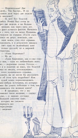 — Вы знаете, Холмс, тут не может быть ни малейших сомнений. Я уверен, что именно этот отрывок, а вовсе не «Гости съезжались на дачу», послужил Толстому толчком для создания его романа. События, описанные в нем, гораздо больше похожи на события, описанные в книге Толстого. А героиня этого отрывка — ну просто точно Анна Каренина. И герой, в которого она влюблена, тоже больше похож на Вронского. Короче говоря, я убежден, что произошла ошибка… мы обязаны извиниться перед нашими читателями, которых мы с вами невольно ввели в заблуждение.