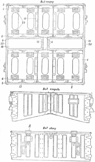 Под каждым лотком приклепано по два резиновых буфера 23 — всего 20 буферов. Назначение буферов — смягчать при перевозке удары лотков о дно короба.