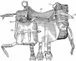К каждой полулуке прикреплены: вьючная планка 17, щечки 29 и 30 для крепления вьючных рычагов и вкладыш (на рисунке не видно), состоящий из двух частей и приклепываемый непосредственно к лукам. За вьючные планки 17 зацепляются своими вырезами вьючные рычаги тех вьюков, которые не требуют для своего крепления универсальных приспособлений. В паз между вертикальной плоскостью полуарки и приклепанной к ней щечкой входит выступ оковки вьючного рычага.