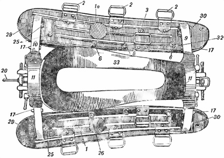 1 — правая полка; 1а — левая полка; 2 — антабка для подпруги; 3 — антабка для путлищ; 6 — болт; 9 — передняя лука; 10 — задняя лука; 11 — замок; 17 — планка вьючная; 20 — костылек к. регулирующему винту; 25 — винт; 26 — гайка; 29 и 30 — щечки для рычагов; 33 — сиденье.