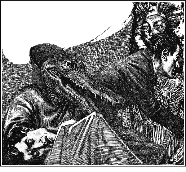 Знание это пришло в последний миг, когда я увидел, как незнакомец погрузил свои хитроумно сработанные крокодильи челюсти в горло бедняги Ваннинга — и разорвал его острыми как сабли клыками. Я успел на мгновение прикоснуться к нему, прежде чем он исчез; да, я схватил его, закричал и пустился в паническое бегство.