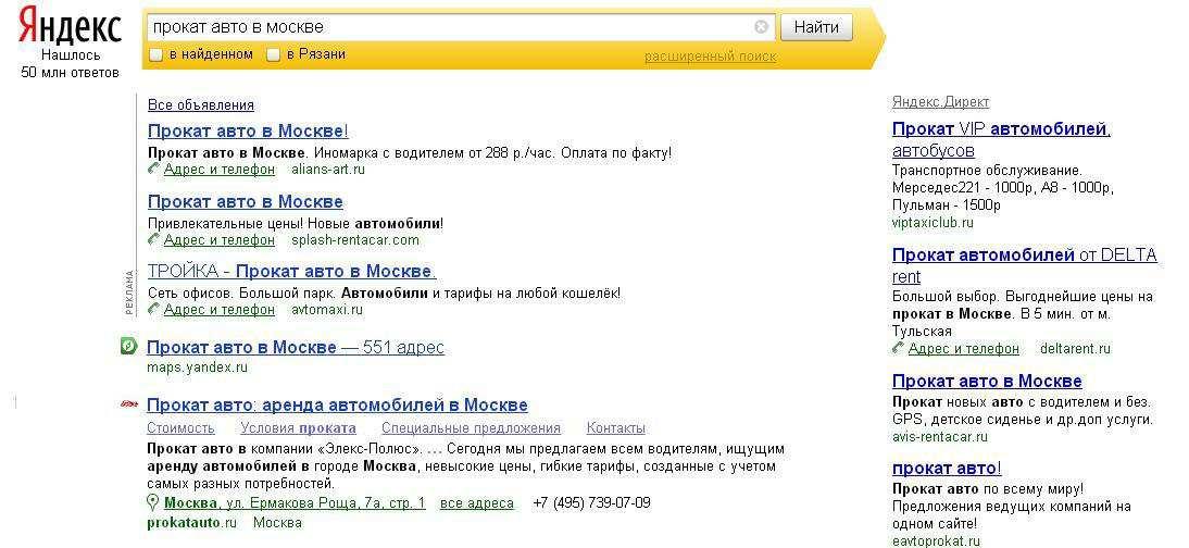 Давайте посмотрим, что выдает Яндекс по запросу “Прокат авто в Москве”: