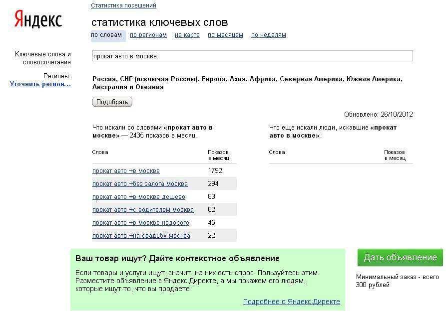 Наберите в браузере wordstat.yandex.ru. Этот инструмент позволяет узнать как часто посетители набирают тот или иной запрос в Яндексе.