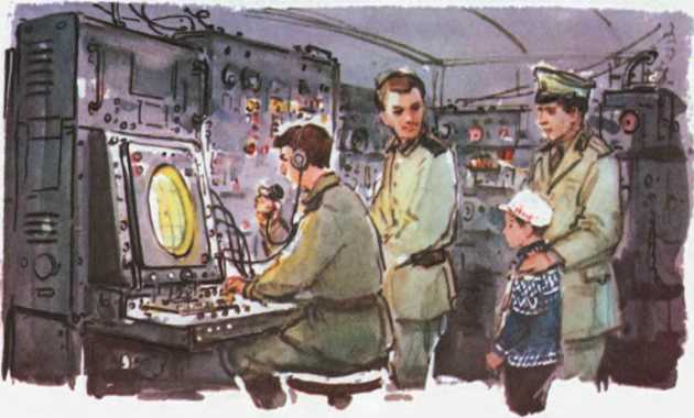 — А возле экрана, — сказал папа, — сидит оператор. Самый важный человек на станции. Это он первым делом замечает на экране самолёт и потом следит за ним и докладывает на командный пункт. А вон, кстати, и самолёт. Смотри.