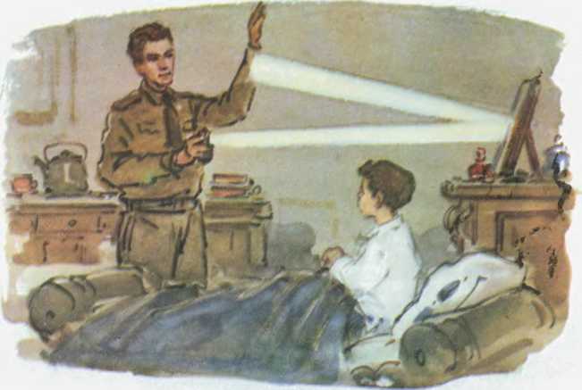 Папа достал карманный фонарик, зажёг его и выключил свет в комнате. Потом начал медленно поворачивать фонарик. Яркий луч света пробежал по стене, наткнулся на зеркало и сразу быстро отпрыгнул назад. На рукаве папиной гимнастёрки появился зайчик. Потом луч упёрся в пузатый бок блестящего чайника и снова отразился — отпрыгнул обратно.