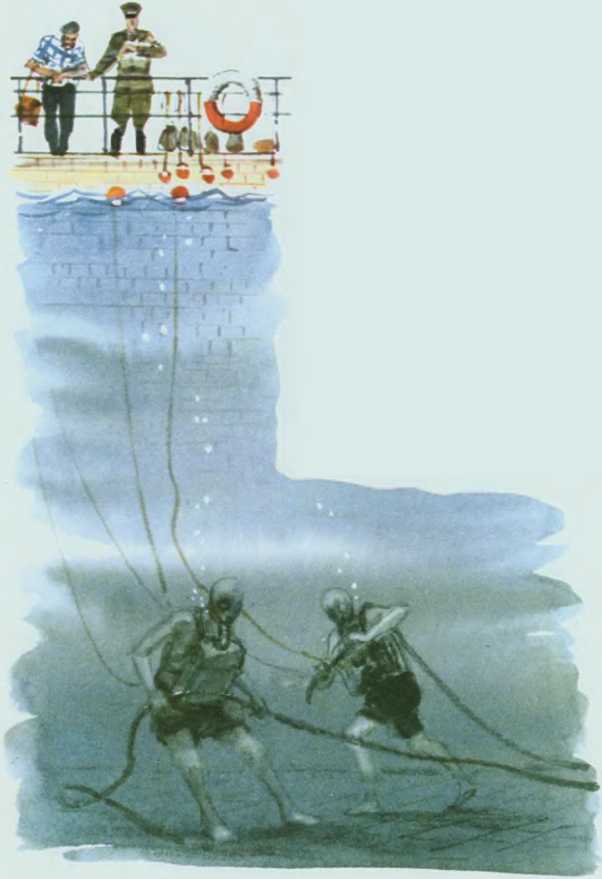 Потом я вытирался полотенцем и с уважением посматривал на солдат, которые готовились спускаться в бассейн. Я-то и пяти минут под водой не пробыл, а выскочил, как пробка. А они сколько работают! Да ещё тяжеленный трос таскают! Каково им?