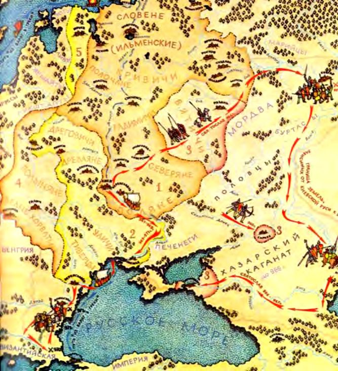 Киевская Русь, IX–XI вв. Синие стрелки — водный торговый путь «из варяг в греки». Скрещенные мечи — места сражений киевских дружин. Красные стрелки — походы Святослава. Границы Киевского государства: 1 — государство при Олеге к 912 г., 2 — земли, вошедшие в Киевскую Русь при Игоре и Ольге к 957 г., 3 — при Святославе к 972 г., 4 — при Владимире к 1015 г., 5 — при Ярославе к 1054 г.