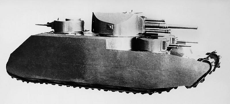 Деревянная модель танка Т-39 в масштабе 1/10 натуральной величины, седьмой вариант. Машина вооружена двумя 45-мм в передних малых башнях, двумя 107-мм и одним 152-мм орудиями в больших башнях.