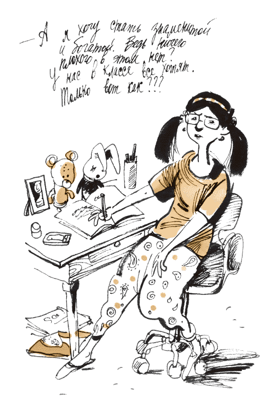 А я хочу стать знаменитой и богатой. Ведь ничего плохого в этом нет? У нас в классе все хотят. Только вот как??? Петь я не умею. В модели не гожусь. Муж-олигарх отваливается автоматически. Они все старые. И так как литература – это единственный предмет, по которому у меня твердая пятерка, мне остается писать модные сценарии. Мое произведение должно быть совершенно нестандартное, чтобы захватило с первых кадров. Ну, например, самая обычная девушка хочет познакомиться со стильным парнем. Он супер и на два года старше… Почему школьная программа по литературе не предусматривает произведения на эту тему? Думаю, это актуально для многих девочек.