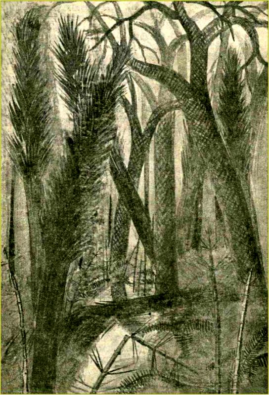 Но привыкает глаз. В оклубившихся буро-зеленых массах, затянувших почву, он различает колонны. Строгие, почти готические, они идут наверх, к светлому небу. Они мощны, в два обхвата. Сердцевидные рубцы в шахматном порядке сплошь покрывают их. Выше они двоятся и затем многократно ветвятся развилинками. И шиловидные чешуи щеткой одевают их.