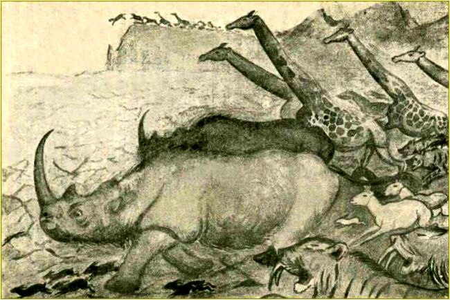 Они бежали по тропам к иссякшим водопоям. Косяк присоединялся к косяку. Бежали гиппарионы, носороги и жирафы. Ковыляли, переходя от бега к прыжкам, обезьяны. Бежали легкие антилопы, широким верблюжьим шагом неслись гелладотерии. Полчища крыс, быстрых зайцев и белко-дикобразов покрывали землю под их копытами.