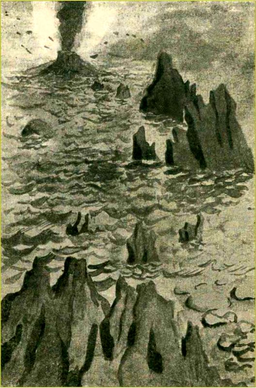 Мутные дни сменялись ночами. Они были беззвездны; воздух, полный паров, не пропускал света. И кровавые дороги, раздробленные мелкой рябью, ложились на океан от пылавших вулканических конусов. Как при бенгальском огне, вырисовывались черные крутизны, близкие и призрачные, глыба на глыбе, осыпанные шлаками и пеплом, опаленные пожаром, бушевавшим в их недрах.