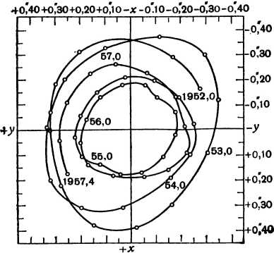 Рис. 13. Движение Северного полюса Земли с начала 1952 г. (1952,0) по апрель 1957 г. (1957,4).
