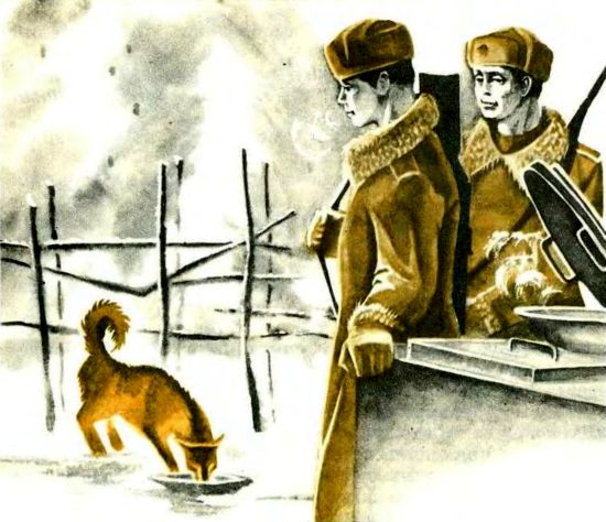 Сибиряков стал на лыжи, надел белый халат, взял винтовку, свистнул. Накормленная собака побежала за ним, как за хозяином.