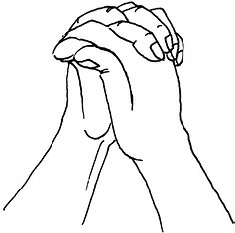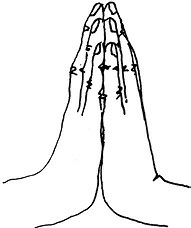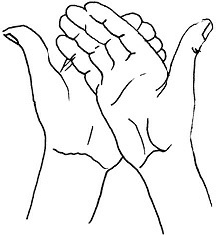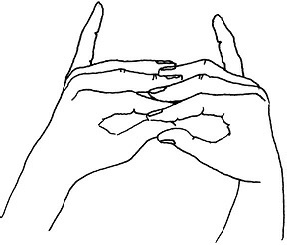 Методика выполнения. Большие и средние пальцы обеих рук соединены. Указательные – остаются выпрямленными, соприкасаясь концевыми фалангами. Безымянные пальцы и мизинцы перекрещиваются будучи расположенными у основания средних пальцев (рис. 7).