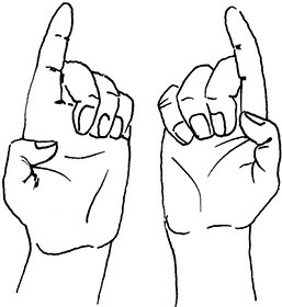 Методика выполнения. Большие пальцы обеих рук прижать к внутренней поверхности ладоней. Указательные пальцы выпрямлены, обращены вверх. Три последних пальца каждой руки согнуты (рис. 5).