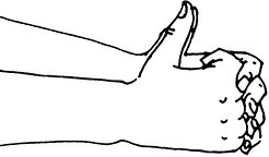 Методика выполнения. Правая рука сжата в кулак, ее большой палец находится внутри. Указательный вытянут вверх. Ладонь наружу. Левая также собрана в кулак. Ее ладонь повернута внутрь. Кончик вытянутого указательного пальца правой руки зажат в кулаке левой (рис. 16).