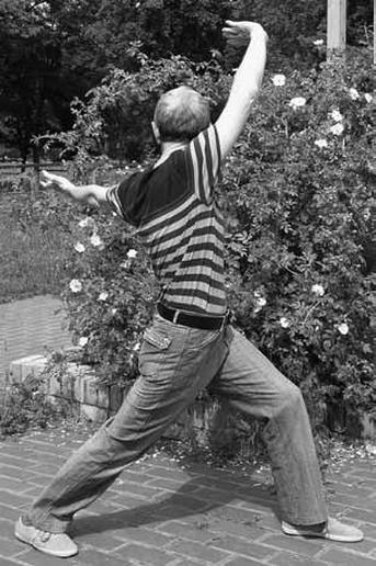 Шагнуть левой ногой влево, принимая стойку «лук и стрела» (согнутая левая нога – это «лук», а выпрямленная правая – «стрела»). При этом правая ладонь движется вверх («толкает небо»), а левая рука (тоже ладонью кверху) движется в левую сторону и назад, будто бросая «за себя» (по дуге влево-назад) метательный нож. В течение всего поворота глаза направлены в ту же сторону, что и левая рука, а ноги прочно укоренены в стойке «лук и стрела».