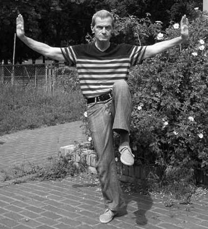 Развести руки в стороны, чтобы они стали параллельны земле, и поднять левое колено. Нога расслаблена, носок «свисает» совершенно свободно.