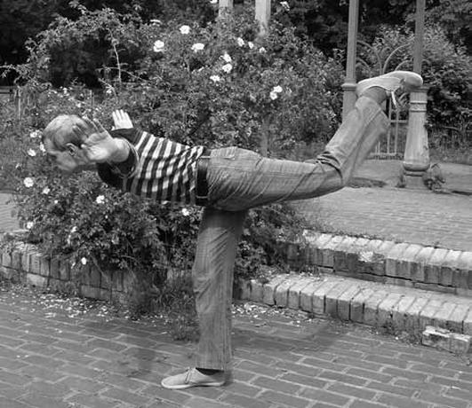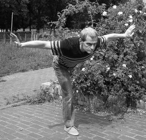 Когда нога окажется сзади, нужно наклониться вперед, одновременно поднимая ногу вверх и слегка сгибая ее. Взгляд при этом не опускается, он все время направлен вперед. В этом положении постоять от времени, равного одному-двум «вдохам-выдохам», до «сколько захочется».