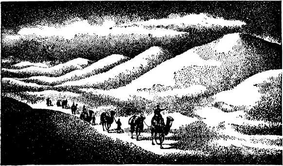 В Средней Азии, от Каспийского моря до Маньчжурии, идет полоса великих пустынь. Огромные пространства этих пустынь, покрытые песчаными холмами, напоминают окаменевшее море с желтыми волнами. Беда, если здесь начинает дуть сильный ветер. Окаменевшие волны песчаного моря оживают. Вершины их начинают куриться, песок вытягивается в струйки, поднимается в воздух. Все барханы приходят в движение. По мере усиления ветра все больше и больше песка летает в воздухе. Во время урагана ветер поднимает в воздух огромные массы песка. Тогда черные тучи его закрывают солнце, жгут лицо и руки, затрудняют дыхание.
