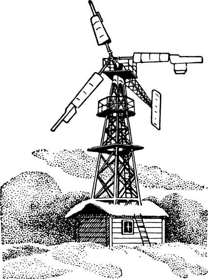 Один из лучших советских быстроходных ветряков средней мощности имеет марку «Д-12». Его мощность — двенадцать-пятнадцать киловатт. Этот двигатель можно применять для самых различных работ: для освещения, молотьбы, орошения полей, очистки и помола зерна, для лесопилок и других машин. Ветродвигатель «Д-12» хорошо работает в Арктике (на островах Ледовитого океана) с 1935 года (рис. 20).