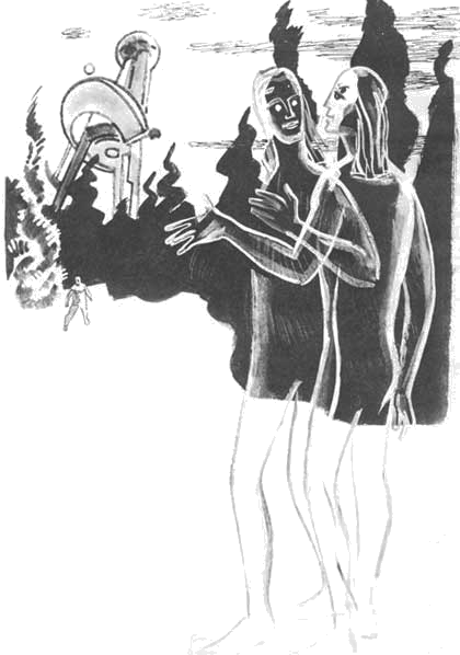 На третьи или на четвертые сутки — не помню точно — начался дождь. Призраки надели накидки, похожие на наши плащи. Мне трудно сказать, какую окраску имели эти плащи: цвет их менялся, временами они становились прозрачными.