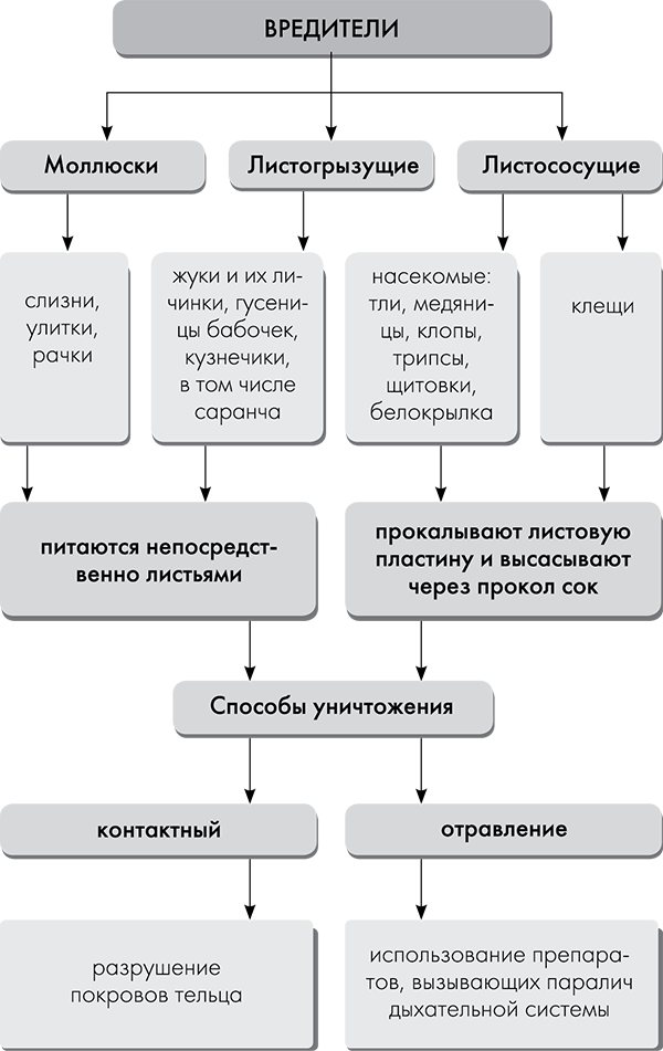 Вредители делятся на две основные группы по способу питания и, соответственно, по устройству ротового аппарата: листососущие и листогрызущие.