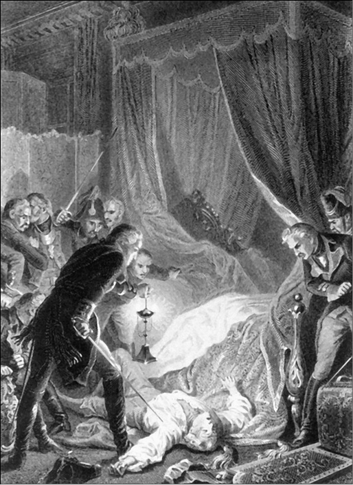 В половине первого ночи 12 (24) марта 1801 года 12 заговорщиков ворвались в спальню императора. Их возглавляли бывший фаворит Екатерины князь Платон Зубов, его брат Николай и генерал-лейтенант барон Леонтий Беннигсен, командир Изюмского легкоконного полка. Павел спрятался то ли за занавеской, то ли за каминным экраном.