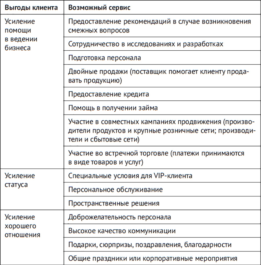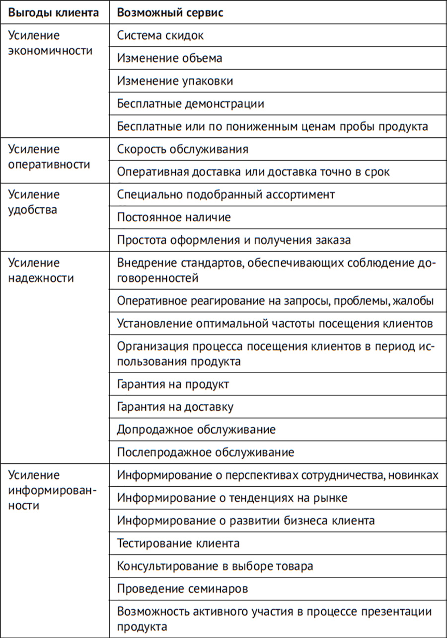 Если набор стандартных выгод для вашего клиента включает другие выгоды, например безопасность, имидж, повышение конкурентоспособности и др., то для этих выгод также необходимо сформировать список возможных вариантов сервиса.