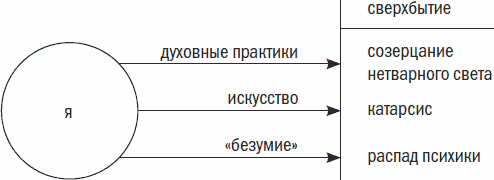 Обособление психики влечет за собой ее переосмысление. Соловьевская универсальная способность «выходить из себя» преобразуется в присущее именно психике стремление к Сверхбытию, к выходу за «антропологическую границу», понимаемую не материально и не пространственно, а энергийно и деятельностно (здесь мы пользуемся концепциями С. С. Хоружего. Уточним, что самим С. С. Хоружим этот подход излагается вне непосредственной связи с ди- и трихотомией). Это «самопревосхождение» (С. С. Хоружий) [11] может осуществляться в разных направлениях: 1) к Богу – духовные практики (в контексте наших задач позволим себе расширить это направление до метафизической сферы в целом); 2) в виртуальный опыт (позволим себе преобразовать эту позицию – применительно к нашим построениям – в опыт эстетического переживания, равно относимый и к художнику, и к зрителю-слушателю-читателю); 3) в безумие. В правой колонке схемы указаны состояния – результаты этих «переходов» (схема 3).