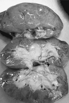 Рис. 6. Острые эрозии и язвы 12-перстной кишки (А), атероартриосклеротический нефросклероз, цианотическая индурация почек (Б) и мускатный фиброз печени (В)