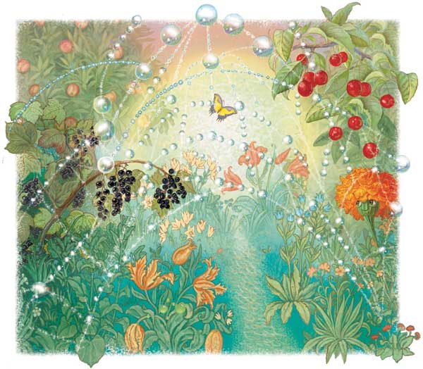 Прямо перед ней в нежном утреннем воздухе возвышались, слегка подрагивая от порывов ветерка и Вариных шагов, сказочные башни, замки, арки: каждый куст, каждый сучок, каждая грядка были обвиты тонкими нитями, унизанными мелким жемчугом. В лучах восходящего солнца все это мерцало, светилось, переливалось. Варюша не сразу поняла, что жемчужные нити – это паутинки, усеянные капельками росы. Они, оказывается, пронизывали пространство во всех направлениях: тянулись от куста к кусту, многократно пересекали садовые дорожки, опутывали кисти смородины и ветки вишни. Только днем они не были видны, а утром, осыпанные росой, стали похожи на жемчужные ниточки. И весь сад превратился в сказочный город, в котором могли бы жить только эльфы и феи, но никак не люди. Там были мерцающие долины и серебристые холмы, сверкающие лесенки и сумеречные туннели, туманные переходы и водопады искорок.