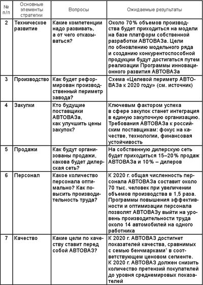 Пример. Основные элементы стратегии компании ОАО «АВТОВАЗ» [11]