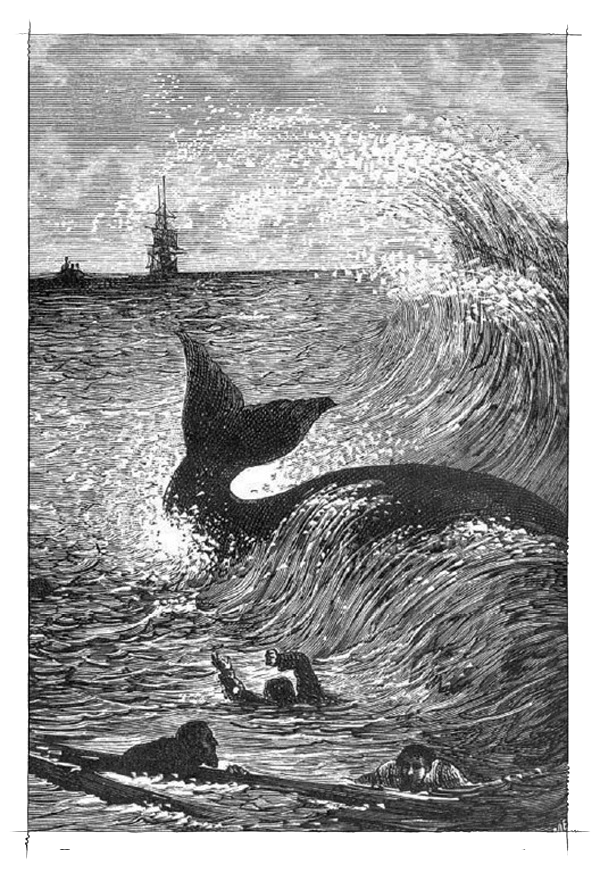 Страшный удар хвоста подбросил шлюпку, чудовищная сила взметнула ее на воздух. Расколовшись на три части, она упала в водоворот, поднятый китом.