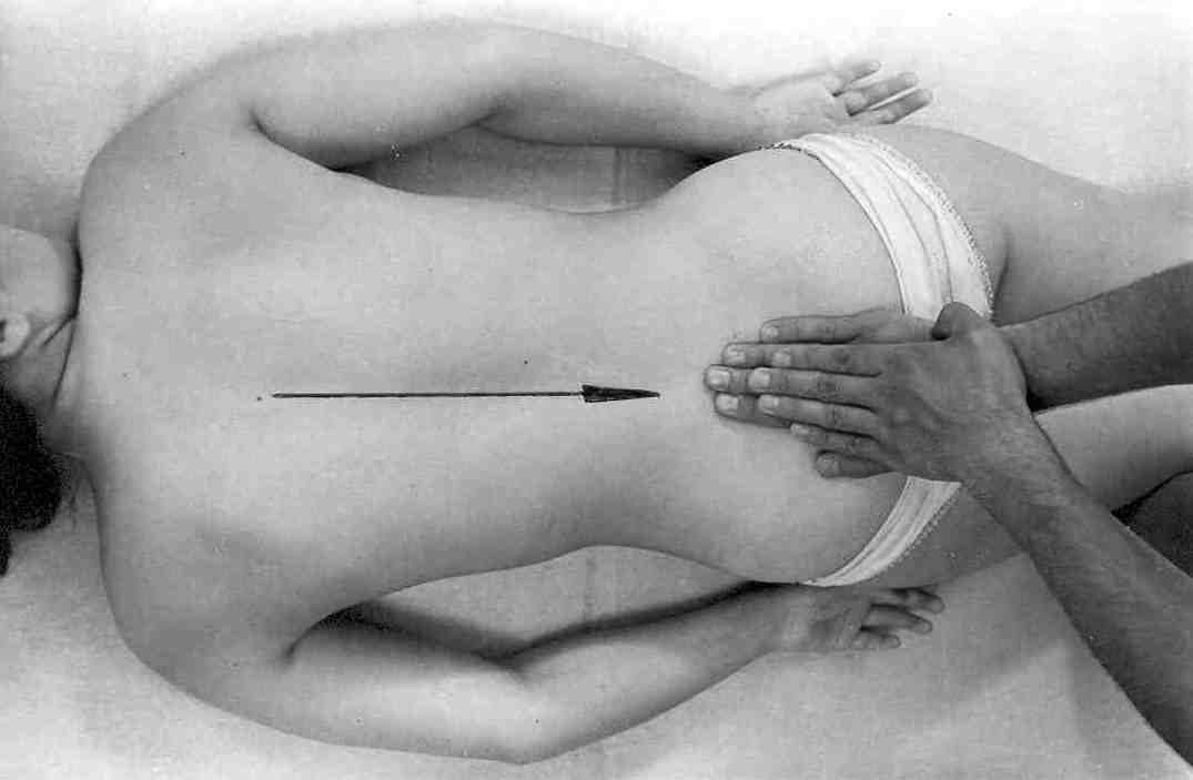 Разминание следует начинать снизу. Захватите массируемую область в районе ягодиц и щипцеобразными плавными движениями гоните «волну» вдоль позвоночника (рис. 8 а, б). Пальцы идут с перехлестом, но не задевая друг друга. С левой и правой сторон прогоните от позвоночника 3–4 «волны».