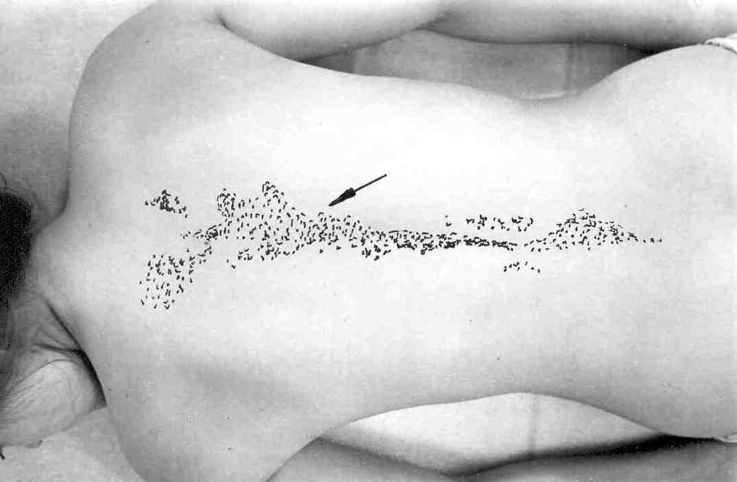 Через некоторое время после начала воздействия на спине вырисовывается очень интересная картина: покраснение вдоль позвоночника (рис. 6). Но вы сразу обнаружите, что некоторые места не изменились. Зная сегментарное строение позвоночника (а об этом речь пойдет при рассмотрении сегментарного массажа позвоночника), нетрудно определить пораженные органы. Соответственно в дальнейшем надо хорошенько эти участки тела проработать.