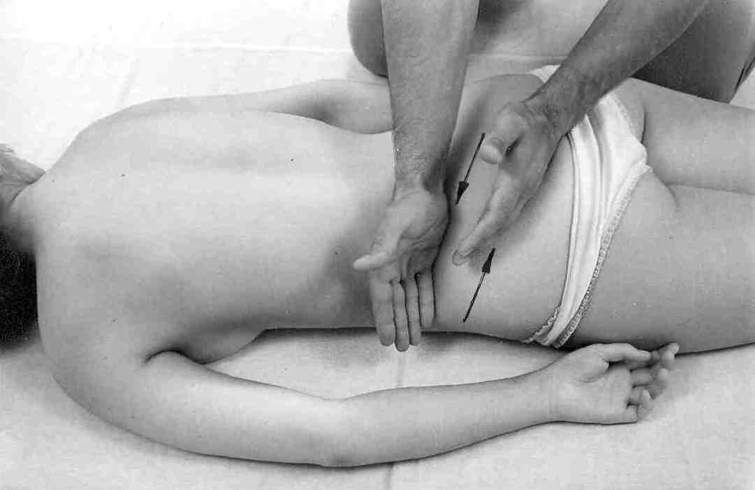 Пиление начинаем от ягодичной области по наклонной вниз, возвращаемся обратно по тем же линиям, делаем вверху переход и снова вниз. Необходимо проработать и левую, и правую стороны (рис. 7 а, б).