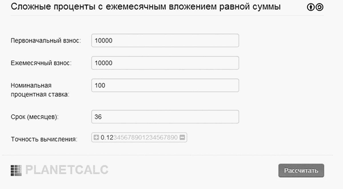 Поговорим о силе сложных процентов. Я хочу, чтобы вы сейчас выполнили небольшое упражнение. Представляю вашему вниманию инвестиционный калькулятор