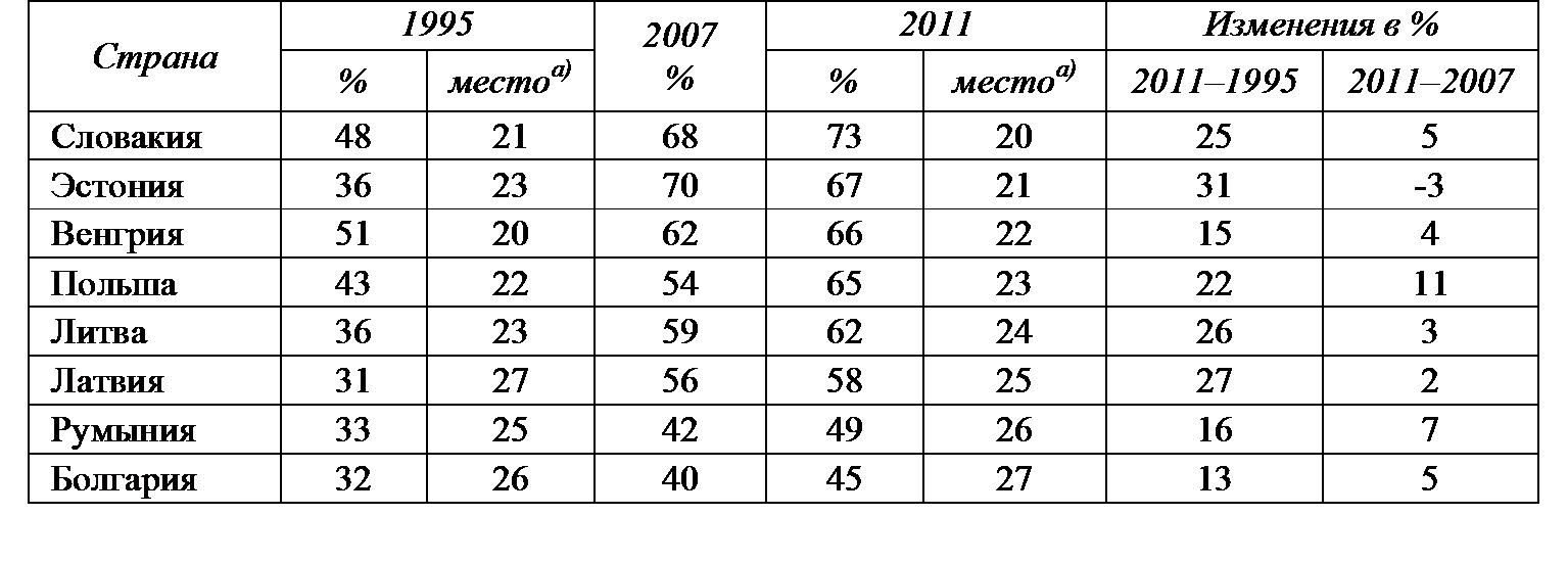 Данные WEF показывают, что в период кризиса в международной конкурентоспособности рассматриваемых государств произошли существенные изменения в соответствии с тенденцией и закономерностями, представленными в вышеприведенном анализе. Среди них обращает на себя внимание несомненный успех Польши, которая переместилась в этой группе с шестого на второе место, а в мировом масштабе с 51-й позиции на 41-ю (в 2010 г. заняла даже 39-е место – лучшее из всех предыдущих, фигурирующих в докладах WEF), опережая не только все государства пограничья, кроме Эстонии, но также и Словакию, которая в 2007 г. серьезно опережала Польшу. Эстония сохраняла первое место в группе, но с трудом, о чем свидетельствует перемещение ее в мировом рейтинге с 27-го на 33-е место, а в 2009 г. даже на 35-е место. Остальные прибалтийские государства значительно ухудшили свою конкурентоспособность, однако в последние годы она несколько улучшилась. Значительно ухудшилась конкурентоспособность Словакии, в Венгрии не было зафиксировано существенных перемен. Последние места занимали Болгария и Румыния, причем последняя в 2009–2010 гг. немного поправила свое положение, опередив Болгарию и Латвию 17 .